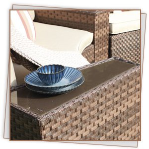 - ćFour Side Tablesć – The sophisticated wicker design side table is hand woven by resin wicker and powder coated steel framed for seasonal outdoor use. It is a great addition to the curved outdoor sectional to keep books, drinks, foods and small plates within reach. The tempered glass table top requires low maintenance.